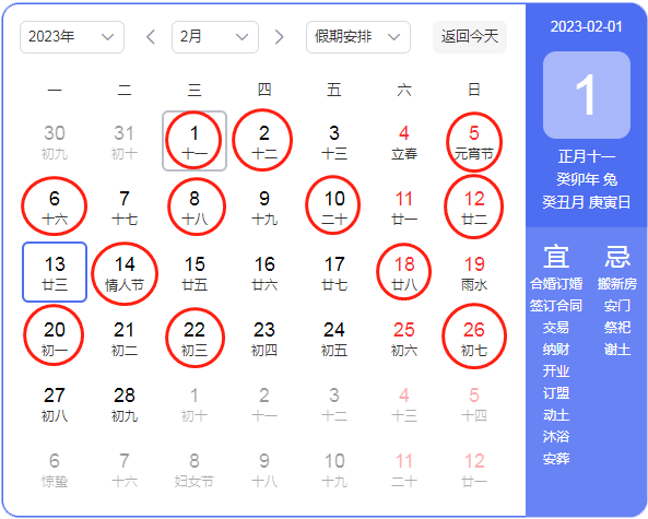 2023年2月份搬家黄道吉日一览表,红色圈为推荐吉日,仅供参考。宜宾搬家公司电话:400-8636118 / 151 8115 8336